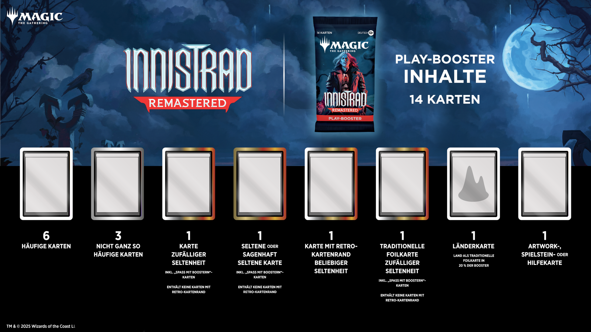 Beachte, dass einige wenige englischsprachige Innistrad Remastered Play-Booster eine doppelseitige Karte enthalten, deren Seiten nicht zusammenpassen. Diese Karten können so gespielt werden, als wären sie mechanisch identisch mit ihrer Vorderseite. Die unpassende Vorderseite einer falsch kombinierten doppelseitigen Karte kann nicht gespielt werden, und solche DSKs gelten nicht als mechanisch einzigartige Drucke oder besondere „Spaß mit Boostern“-Kartendrucke.