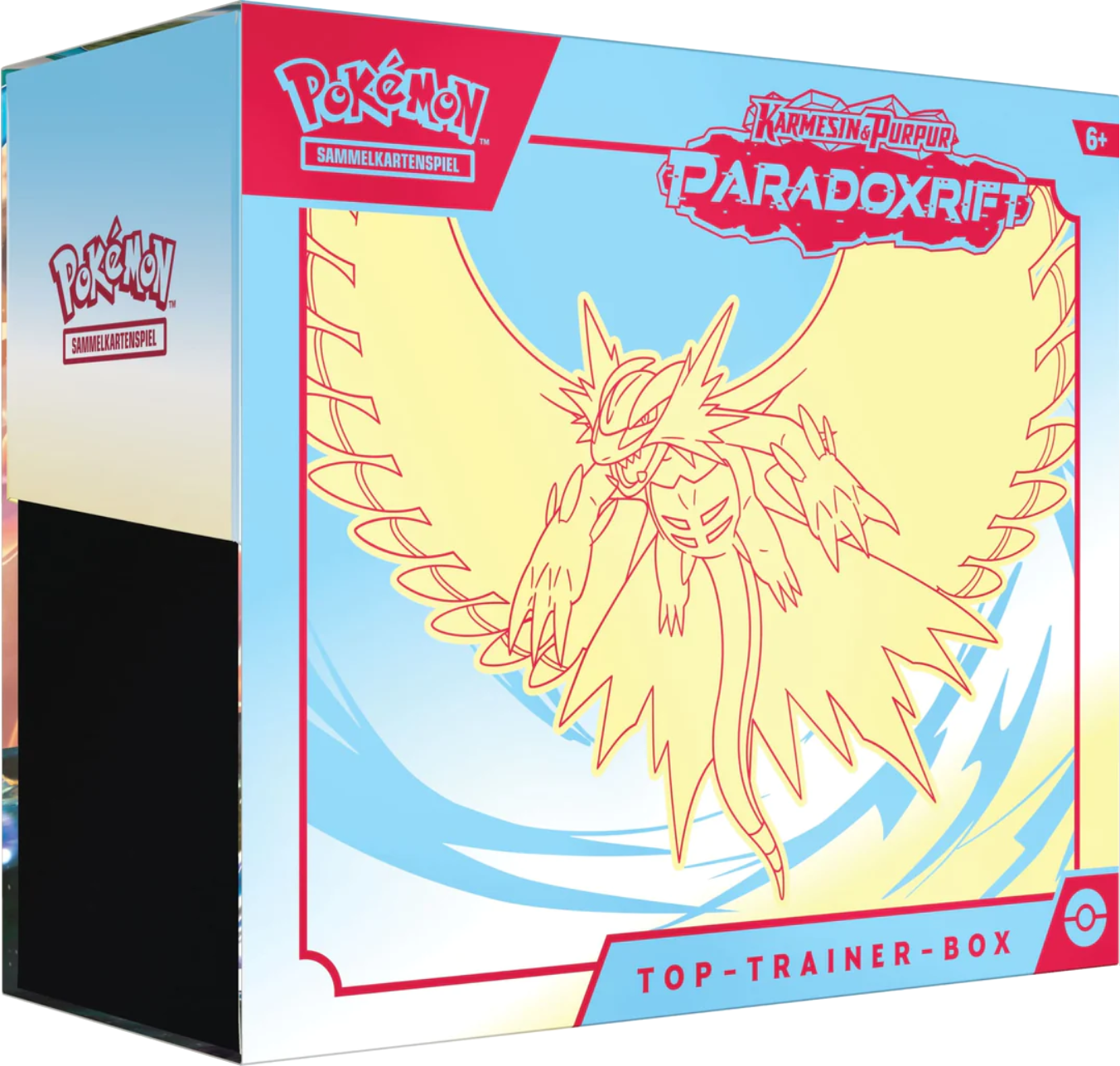 Die Top-Trainer-Box Karmesin & Purpur – Paradox Rift des Pokémon-Sammelkartenspiels enthält: